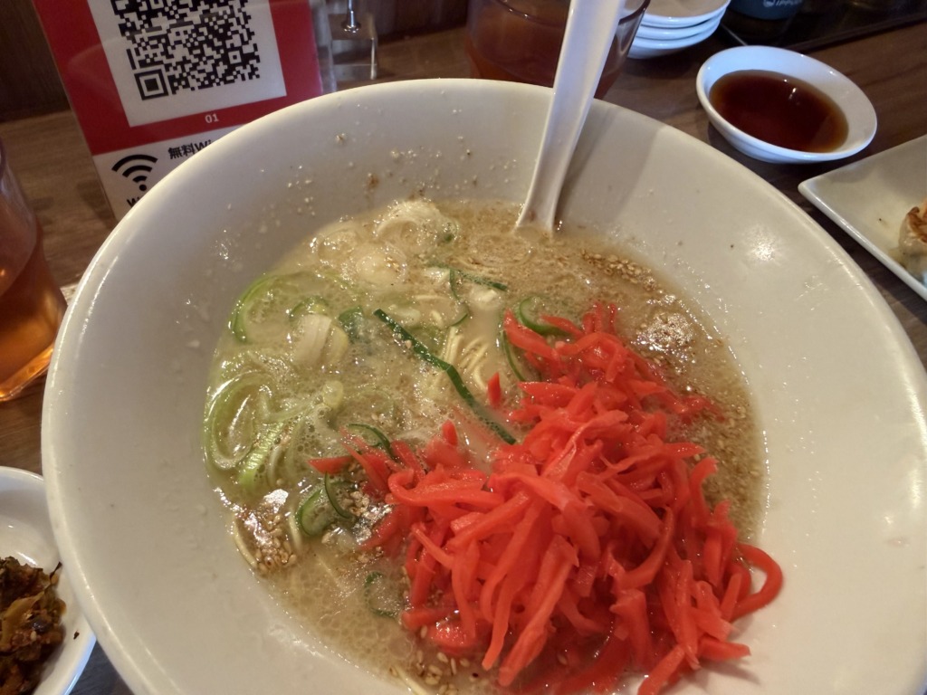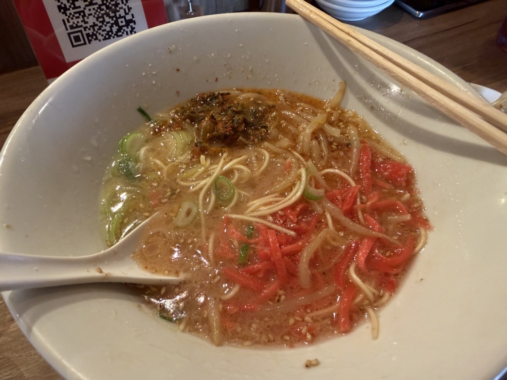 次は、無料のトッピングの紅生姜を入れて食べてみると、コクのあるとんこつスープが少しさっぱりとした味わいに変化します。