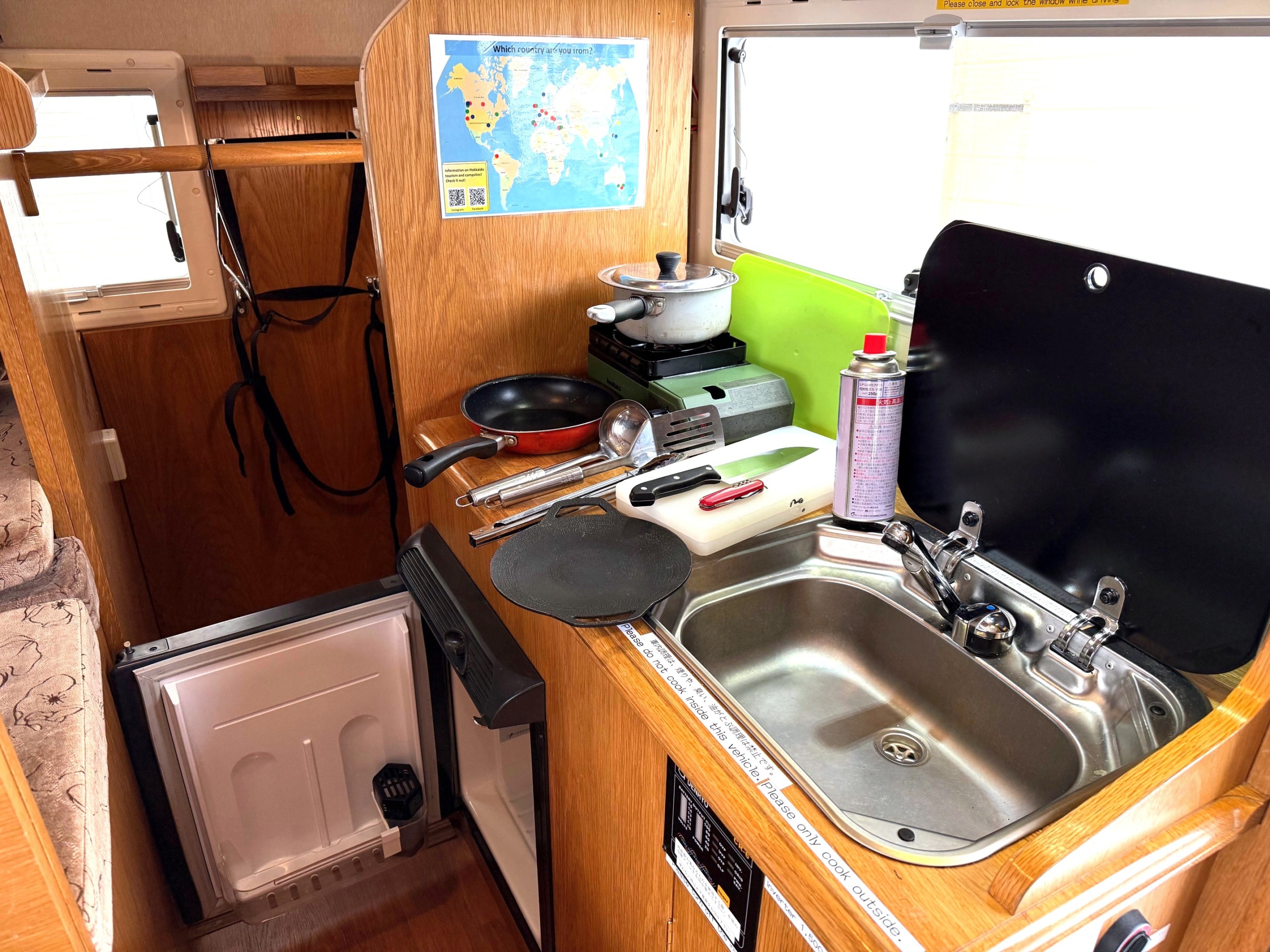 It is equipped with electrical switches for lighting and an inverter, as well as a water sink, a 40L refrigerator, a free-standing gas range, and a kitchen set.